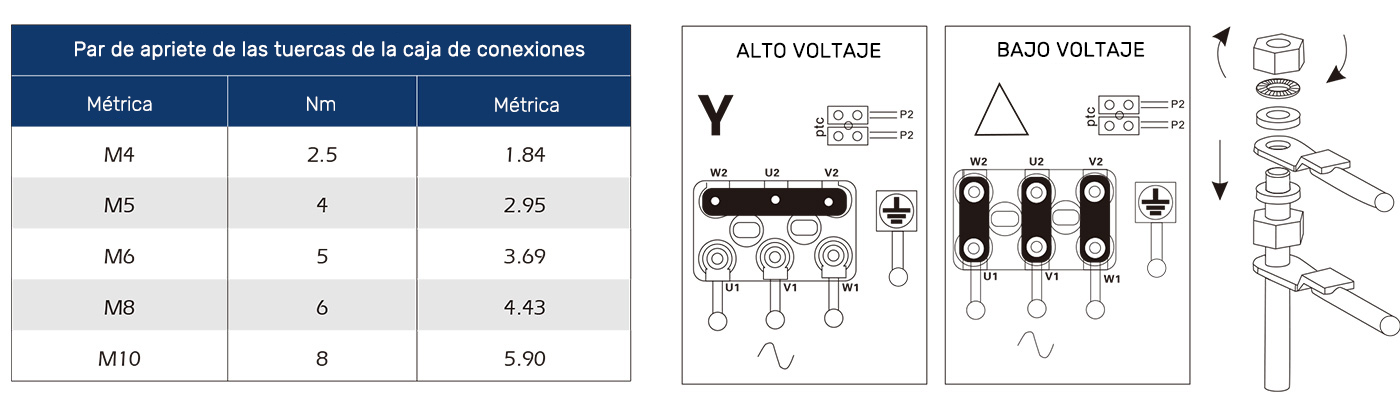 Asegúrese de que el voltaje y la frecuencia de suministro coincidan con los indicados en la placa de características del vibrador eléctrico. Inserte el cable de alimentación a través del prensaestopas. Utilice solo conductores con sección transversal adecuada. Conecte el cable conductor a los pines [como se muestra en el diagrama a continuación y apriételos con el par especificado.