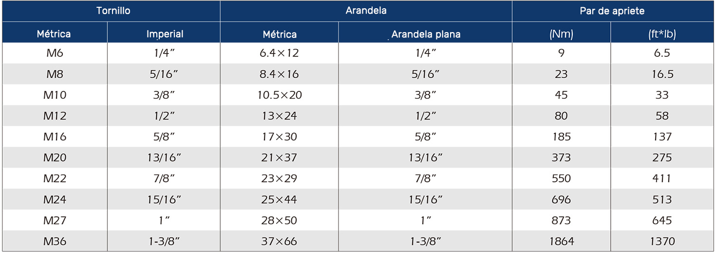Use tornillos de clase 8,8, tuercas de clase 8.0 y arandelas planas de la categoría A EN ISO 7089/7092.