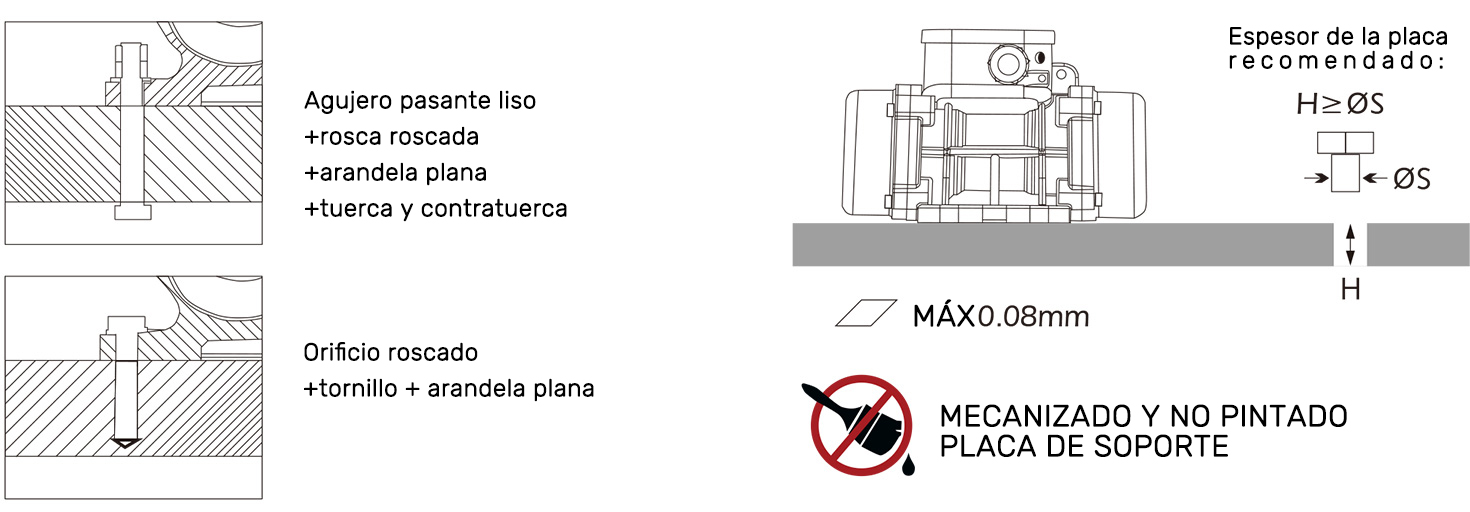 La superficie de la placa base donde se monta el motor vibrador tiene una tolerancia permitida de 0,08 mm, para que la superficie repose uniformemente y se evite tensión interna, lo que podría causar la rotura del pie del motor vibrador.